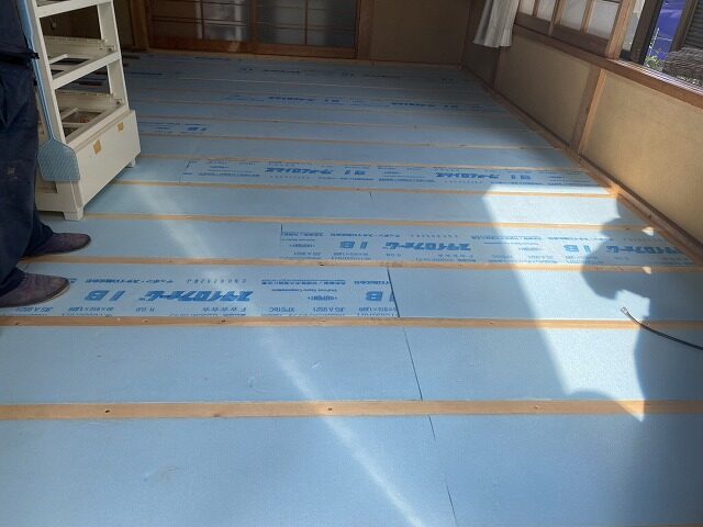 下地材に合板、その上に12㎜フローリングを張っていきます。